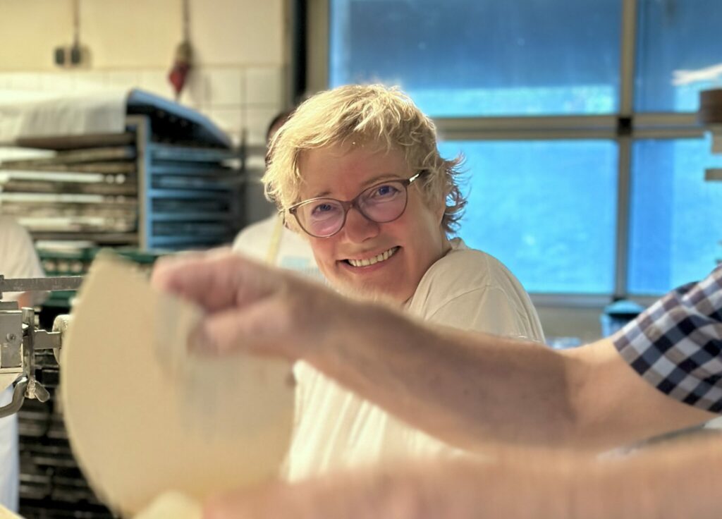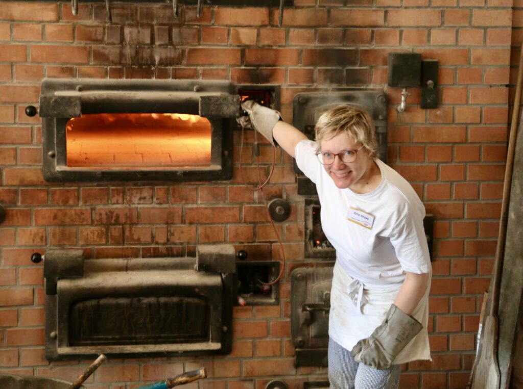 Heute backe ich mit Gruppen jeden Alters Brot, Brötchen oder Pizza in dem professionellen Holzbackofen, in dem bis zu 240 Brote gleichzeitig gebacken werden.